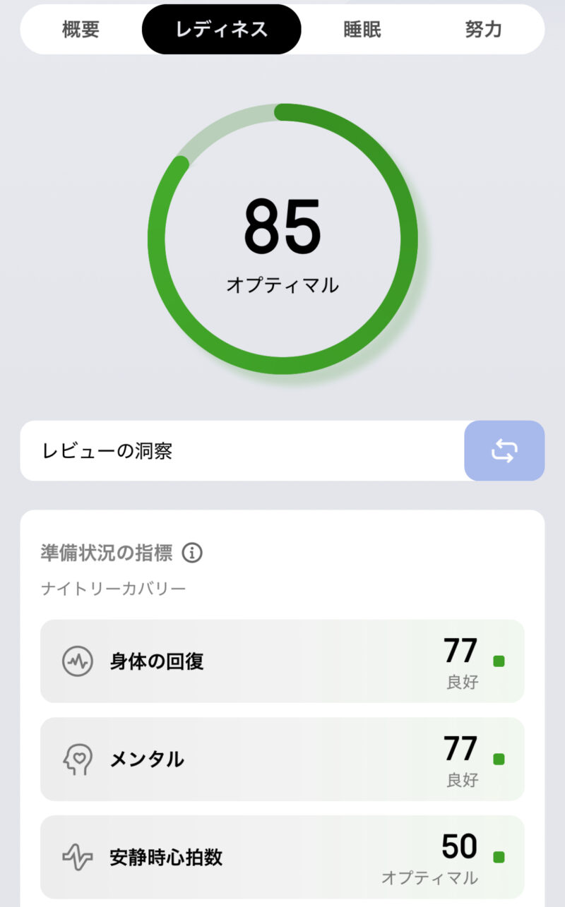 睡眠トラッキングを通じて「レディネス値」という身体やメンタルの回復度合いを示す指標を提示してくれます。体感良く寝られた日は見るからにこの値が向上するので、数値を上げるために良い睡眠取りたくなります(笑)