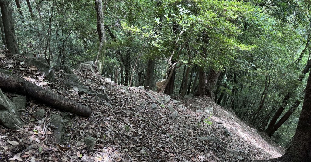 登山道に復帰後、1.5kmほど降ってきた花折戸尾根の登山道を登り返し標高850m付近へ到達します(図①を参照)。その際に登山道、あるいはその付近から逸脱し斜面をトラバースする進路を取り崖の先でGPSログは途切れています。
