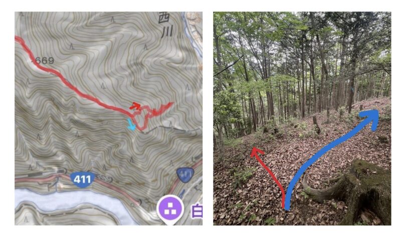 幸いなことにこれを一度北に取ることで回避し標高550mを越え登山道へ復帰しています。