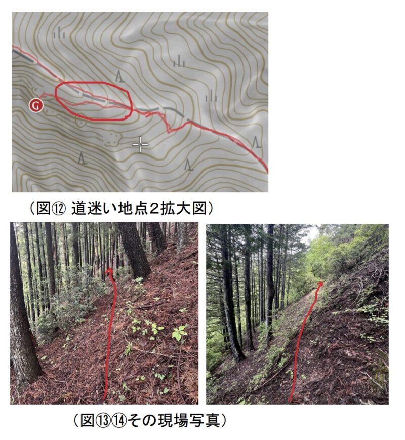 遭難者は2時間の間に2回道迷いに陥り、1度は道迷いから回復し登山道に復帰することができたもののその後の移動の最中に2度目の道迷いに陥りそのあと致命的な結末へと至ったと思われます。