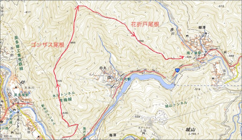 ゴンザス尾根と呼ばれる尾根を南から登り、標高1000m程度の地点から花折戸尾根方面へ南東進し鳩ノ巣駅付近の登山口へと下山するルートです。