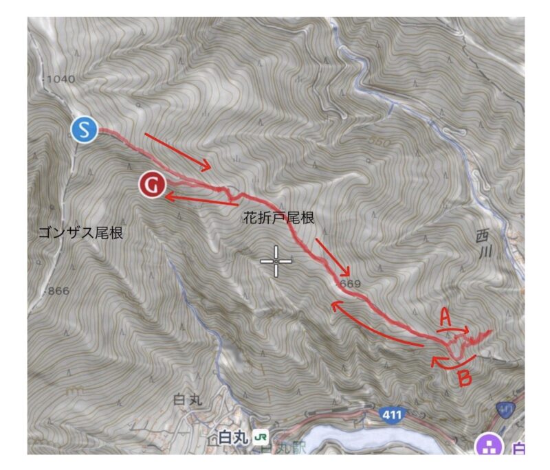 その後530m付近まで当該尾根を、450m付近までその南の沢を降ったのちに登り返しています。