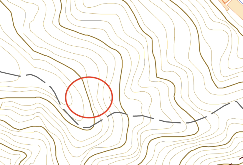 また17時10分ごろに遭難者から「周囲が険しく進めない」と連絡があった箇所はGPSの軌跡と登り返しからの経過時間、GPSログが最終的に終わる地点までの距離・獲得標高から図③で示した赤丸の等高線が詰まった箇所ではないかと推察できます。