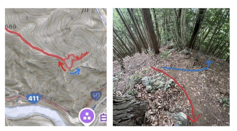 2020年3月22日に訪れた大峰山での出来事です。画像の通り分岐から斜面をトラバースする道(赤矢印)に入り込みあわや現在地がわからないという状態に陥りました。