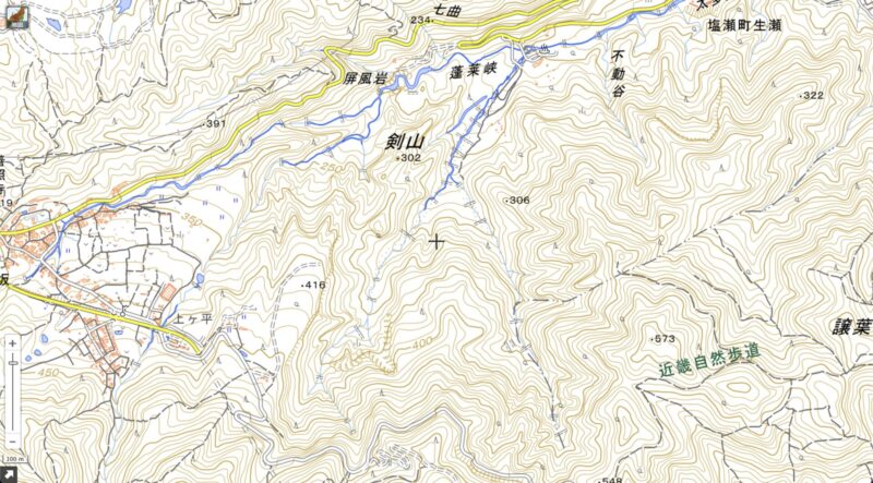 このように道の表記が地理院地図では全く無い箇所ですがYAMAPでは一般的な登山道として表示されています。画像としては載せていませんが山と高原地図では破線ルートです。