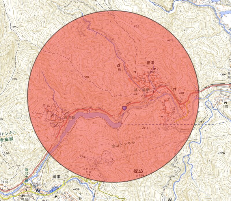 ざっくり地理院地図に表示されてい範囲を赤い円として投射してみました。鳩ノ巣駅はともかくとして、白丸駅やさらにその上部の住宅地まで表示しているのは、目前のナビゲーションに使う情報としては不必要ですし、自身の付近の情報が「なんかでっかい尾根にいる」くらいしかわかりません。
