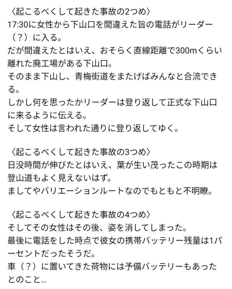 ここまでは事実をベースとしてそこからわかる範囲での推察を述べてきました。見えてきたのは1度目の道迷いに陥ったところから辛くも復帰したが、再度道迷いに陥ってしまい最終的に致命的な結末へと至る道筋でした。
